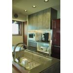 吊戸棚と左壁を撤去し、開放的なキッチンへ。 吊戸棚のあった部分には梁型を組み、手元灯としてダウンライトを設置。