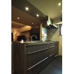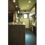 キッチンの壁を取り払いオープンに。 手元灯のダウンライト設置部分は梁型を組み通路側の天井と高さを合わせました。 キッチン側とダイニング側の天井高さを合わせて、色を統一することで、よりキッチン回りのグレー色が引き立ちスタイリッシュに。