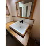 洗面ボウルや鏡は大きめのものを採用し、使いやすい洗面台にしました。台下には収納スペースも造作しました。