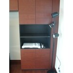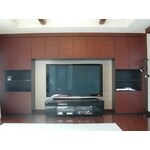 重厚感のある、濃い色使いの床や梁のインテリアに合わせたデザインの壁面収納です。