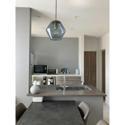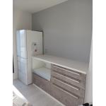 収納力抜群のおしゃれなカップボードを新規で設置しました。上台を設置しないため、通常より高めの100センチの高さにし、さらに奥行きが55センチと一般より10センチ広いタイプにすることで、抜群の収納力を実現。かわいらしいキッチンになりました。 また、リビングの一面にはエコカラットを設置しました。湿度が高い時は湿気を吸収し、乾燥している時は湿気を放出。エコカラットプラスはすぐれた調湿機能で快適な湿度に保ちます。珪藻土の約6倍、調湿壁紙の25倍以上の効果です。 デザインだけではなく、機能も優れた商品です。 アクセントクロスは表面強度が高いスーパー耐久性で、ペットによる爪の傷や、衝撃にも強い商品です。 アクセントクロスとキッチンの腰壁、キッチン裏をグレーのクロスに貼り替え、シックな印象のおしゃれなリビングになりました。 ご担当者様は迅速で細かいご連絡でお気遣いを感じ、安心してお任せすることができました。 作業いただいた方はみなさん知識も技術もしっかり持ち合わせており、想像以上の大満足のリフォームとなりました。 また何かありましたら是非お願いしたい、と大変嬉しいお言葉をいただきました。