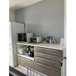 収納力抜群のおしゃれなカップボードを新規で設置しました。 毎日使う家電が多いとのことで半分は家電収納スペースに。上台を設置しないため、通常より高めの100センチの高さにし、さらに奥行きが55センチと一般より10センチ広いタイプにすることで、抜群の収納力を実現しました。 取っ手はどこからでも引きやすいロングタイプに。扉カラーと同系色にすることで扉になじんだデザインになりました。 カップボード設置に伴いコンセント位置を少し上に移動し、デザインに合わせたコンセントプレートへ交換しました。 扉は質感のあるグレーを選択し、扉カラーと合わせて背面のクロスを薄いグレーのアクセントクロスに貼り替えました。かわいらしくおしゃれな雰囲気のキッチンになりました。