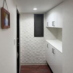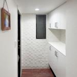 玄関まわりのリフォームでは、「明るくお洒落で高級感のある空間にしたい」というご要望をもとに、素材やデザインにこだわったご提案をさせていただきました。 壁面には、上質な質感と機能性を兼ね備えたリクシルのエコカラットを採用し、空間全体に上品な陰影と重厚感をもたらしています。光の当たり具合によって表情が変わるため、時間帯によって違った雰囲気が楽しめるのも魅力のひとつです。機能面でも、調湿や脱臭といった快適性を高める効果があり、玄関という空間にふさわしい素材となっています。 シューズボックスには、パナソニックの「ベリティス コンポリア」を採用しました。真っ白で光沢感のある美しい表面パネルが特徴で、空間を明るく清潔感のある印象に仕上げています。腰丈のベースキャビネットに加え、同じデザインで統一した吊り戸を設置することで、収納力を大幅にアップさせながら、すっきりとしたデザイン性も実現しました。 全体として、玄関に入った瞬間に洗練された雰囲気を感じられる、上質で居心地の良い空間に生まれ変わっています。