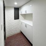 新しい洗面化粧台との隙間に腰壁を造作して、新しい洗面化粧台とお気に入りの壁面収納を違和感なく調和させ繋ぎました。奥の洗濯防水パンと洗濯水栓も新しく交換されリフレッシュしました。