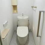 採用したのは、TOTO製のピュアレストEX。丸みを帯びたタンク形状は、見た目にもやわらかで清潔感があり、ホコリのたまりやすい凹凸を減らしているため、お掃除のしやすさが格段に向上しています。また、少ない水でもしっかり洗い流すトルネード洗浄と、汚れがたまりにくいフチなし形状により、毎日のお手入れがぐんとラクに。超節水タイプなので、機能性とエコ性能のどちらも妥協せずにお選びいただけます。 内装面では、壁と天井にはシンプルな白のクロス、床には石目模様のグレートーンのクッションフロアを採用し、落ち着いた自然色でまとめました。以前の細かな花柄模様のクロスから一新され、空間全体がよりすっきりと洗練された印象に仕上がっています。 さらに、柔らかな板目の棚付き二連紙巻器や木製手すりを設けることで、機能性とデザイン性を両立。やさしい素材感が空間に温もりを加え、使いやすく、安心感のあるトイレとなりました。 清潔感と落ち着き実用性に優れたトイレ空間が完成しました。