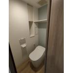 ダークブラウンのアクセントクロスとスマートな形状のトイレ