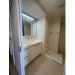 洗面台、洗濯機パン、水栓金具を交換しました。 クロス、床材も一新しています。 入口の建具を開き戸から引戸に変えて、動線が改善されました。