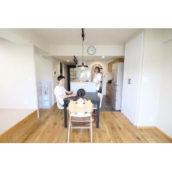お子さまが歩き回れるようになり、それまでのお住まいが手狭になったため、物件をご購入されました。 壁に囲まれたクローズドキッチンはオープンに、個室はご家族構成に合わせて減らすことでLDを広くしてワークスペースと小上がり畳コーナーを設けたいというご希望でした。 今のライフスタイルに合わせて、玄関はベビーカーやスーツケース、外遊び道具などを置けるようにしたいというのもご希望されていました。