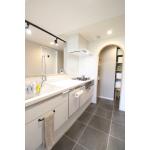 対面キッチンは、お子さまの遊び場となる小上がり畳に向かった配置をご提案しました。 ダイニングテーブルが横並びになる配置なので、小さいお子さまの食事の際もキッチンとの行き来が楽にできるのが嬉しいポイント。 キッチンの奥には、アーチ開口をアクセントにしたパントリーを設けています