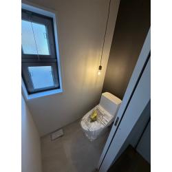 トイレ背面と床材は、お施主様お好みのグレーに。ペンダントライトもセットし、やさしく照らしてくれる空間としました。