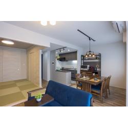 間取りはそのままで、元々ある和室は、和モダンにリノベーション。グレーをベースにネイビーのアクセントがカッコいいLDKと調和する、居心地の良い空間に生まれ変わりました。 カビや結露も気になっていたので、洋室の天井・壁内に断熱ボードを施工。また、玄関、トイレにエコカラットを貼り快適さとおしゃれな空間を同時に叶えました。