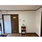 左側のドアをそのまま使うため、床材や建具の色合いは同系色で選びました。