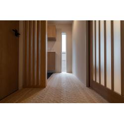木目が美しいフロアーと珪藻土仕上げの内壁の廊下