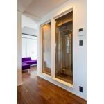 アイランドキッチンを設置するために、エレベーターを中心としたLDKプランをご提案。 存在感のあるエレベーターはあえて機械部分が見えるようにFIX窓へと変更し”魅せるエレベーター”へ。 また梁の圧迫感をなくす為に、折り上げ天井や間接照明を工夫し可能な限り空間に広がりを持たせました。