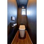 トイレは内装のみ工事をお任せいただきました。 全体的にスタイリッシュモダンな雰囲気をご希望だったので、天井・壁は漆喰風の柄で落ち着きのある壁紙を選定。 床はLDKのフローリングと繋がりを持たせるため、同色のフロアタイルを施工しました。 シックでお洒落なトイレ空間が完成しました。