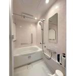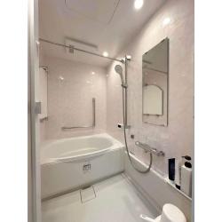 L社のリノビオを設置いたしました。 カウンター部分は、使わない時には簡単に折りたたむことができ、広々とした洗い場にすることが可能です。浴室パネルはピンク系カラーを採用したことで、明るく柔らかい印象に仕上がりました。 浴槽は角の少ないやわらかな形状でゆったりと、くつろいで湯船に浸かれます! 浴槽横や正面に手すりがあるため、立ち上がりの際は、非常に便利です!