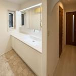 洗面室の計画にあたっては、日常的に使う場所だからこそ、使い勝手と意匠性の両立を重視しました。廊下から洗面室へと続く入口にはアーチ型の開口を採用し、空間にやわらかな印象と上品な雰囲気を添えています。洗面化粧台には、すっきりとしたデザインと高い機能性を兼ね備えたLIXILの「ルミシス」を採用しました。カウンターとボウルが一体化した滑らかな形状は、水ハネや汚れがたまりにくく、お手入れのしやすさに優れています。自動水栓を採用し、衛生面にも配慮しました。また、奥行がコンパクトなため、限られたスペースでも広がりを感じられる工夫が施されています。ご家族お二人が横に並んでもゆとりをもって使える十分な幅も確保されており、毎日の身支度も快適に行える空間となっています。さらに、洗面室に続く通路の奥に洗濯機置き場を兼ねた脱衣室を設け、空間を無駄なく上手に仕切ったレイアウトに仕上がりました。限られた空間を無駄なく活かし必要な機能を漏らさず備えた変形レイアウトの洗面室となっています。