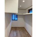 収納を充実させたいとのことで、広めにWICを確保しました。たくさんハンガーが掛けられて、どこに何があるか分かりやすいようコの字型に。カバン等も収納できるよう上部に棚を設けました。