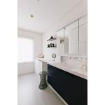 デッドスペースだった廊下を取り込み・トイレを移設したことで実現できた水廻り空間。使い勝手も雰囲気も抜群です。