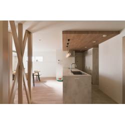 ダクト配管のためにキッチン天井を下げることを利用し木目のクロスでトーンを下げて全体の色のバランスを取ることが出来ました。