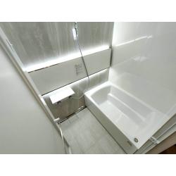 ラグジュアリーミラーがサイズアップした浴室を更に広く、上質感たっぷりに! 調光機能付きライン照明、ホワイトとアイボリーグレージュコーデはお施主様こだわりの空間です。 理想をカタチにしたお手入れカンタンユニットッバスに!