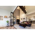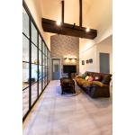 和室から間取りを変更し、リビングへ改装しました。 ブリック調のクロスと梁が調和し、明るく心地の良い開放的な空間に。 インナーバルコニーとの間にはクリアな間仕切りを採用し、 窓からの光がリビングまで届き、より広がりを感じられるようになりました。