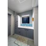 ニッタイ「ライナー彩」のレイクブルーを採用しました。 LED照明がブルーのタイルを優しく照らし、より美しく洗練された雰囲気を演出してくれます。 アクセントタイルは洗面台のブルーグレーと調和し、さらに明るく洗練された空間に。