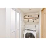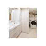 今回洗面所とお風呂の間取りは変えず、配管を新しいものに取り替えました。 洗面化粧台には、LIXIL L.C(エルシィ)を設置しました。ミラーは三面鏡、収納は2段引き出し・トールキャビネット仕様にしました。 今まで以上に洗面化粧台の収納量が増え、スッキリとした洗面所となりました。 洗濯機の上には使い勝手を考え、可動棚を取り付けました。空いていたスペースにも収納できます。