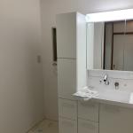 LIXILのピアラを設置させて頂きました。 洗濯機の位置を変更し、標準タイプのキャビネットを設置させて頂きました。 壁のタイルは解体し下地から施工させて頂きました。