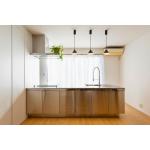 既存のレイアウトを変更し、空間全体の印象をガラリと変えるキッチン空間をプラン。 キッチンはデザイン性と機能性を兼ね備えたステンレス製のサンワカンパニー「グラッド45」を選定しました。 マグネット式のフックやタオルハンガーなどを自在にカスタマイズできる点もポイントです。 お客様を招いて料理を振る舞うことが多いため、存在感のあるキッチンが空間の主役となるようプランしました。