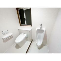 大便器はキャビネット付きのトイレ、LIXILのリフォレをご提案しました。 両サイドにトイレ用品を収納でき、給水管やコード類が見えず見た目もすっきり。 小便器も一新しました。 大便器と小便器の間には段差があり、安全のため見切り材のみ目立つ色に。 トイレ本体や内装は白色で統一し、清潔感のある空間になりました。