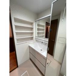 受け部分が広い白色の洗面台を採用し、壁をくり抜いて収納スペースを設けました。スッキリとしていて使い勝手の良い洗面エリアとなりました。