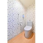 内装は奥様のこだわりが詰まった素敵な空間に。 壁紙は奥様のお好みで花柄を選定しました。小柄の花柄は圧迫感を与えず、空間を広く見せる効果もあります。 ブルーグレーのトイレに柔らかいブルーの花柄の壁紙を合わせることで統一感が生まれ、リラックスできる空間を演出し大変満足していただきました。