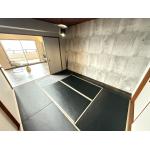 コンクリート打ちっぱなし風の壁紙がモダンな印象を与える和室。イグサの畳ではなく、ダークな樹脂畳を採用することで、スタイリッシュな空間を演出しています。天井には思い切って茶・オレンジ系のクロスを採用。暗くなりすぎず、現代的でおしゃれな和室に仕上がりました。