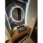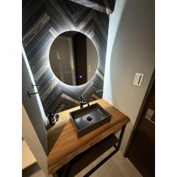 お施主様のセンスが光る洗面台になるよう、微力ながら、内装材やボウル・水栓の選定のアドバイスをさせていただきました。暗くなりすぎないよう、間接照明付きの洗面台をお選びいただいたので、ホテルかのような空間に仕上がっています。