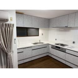 明るいグレーで広く感じるキッチンに仕上がっています。