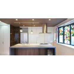 床の張り替える工事から始まったLDKのリフォーム計画ですが、オーダーメイドのダイニングカウンターと綺麗に生まれ変わったキッチン、きれいになった床や天井のアクセントに、お客様が新築当初こだわって取り付けたステンドグラスも合わさりY様の思い描いていたキッチン空間を作ることが出来ました。