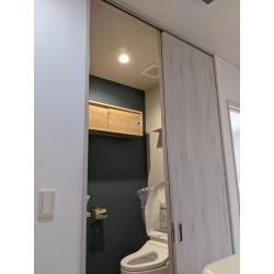 外から配管を引っ張ってきて、廊下に素敵なトイレが出来上がりました。 廊下のため、ドアの開閉に支障がないように引戸にしました。