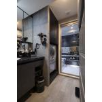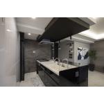 黒を基調としたアクセントパネルと間接照明が、高級ホテルのような空間を演出。水はけの良い床はお手入れも簡単で、デザイン性と機能性を両立させました。