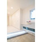 窓からの光と玄関框の間接照明で明るくラグジュアリーな玄関に生まれ変わる