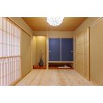 6帖の一部を広縁に。一角には茶室の水屋風のスペースを設けました。 押入れは下部に抜け感を生む吊り押入れに変更して、ふすま紙を藍色に。 壁は和を感じる、伝統的な聚楽壁としました。