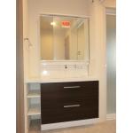 改装後は広めの洗面所に改装 幅90cmの洗面化粧台の左側スペースを活用して 小物用収納棚を造作