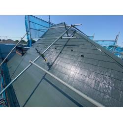 屋根の勾配急なので屋根足場を設置安全な状態で屋根塗装を行っていきます。