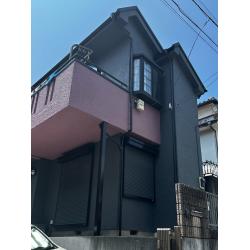 外壁のベースは黒に近い濃い目の色を塗装し ベランダ部分はアクセントでピンク系の色を塗装行いました。 一部分色を変えるだけでデザイン性のある仕上がりになります。