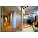 専用庭を眺められるお住まいをテーマに、透明の引戸や窓、間接照明などご夫妻のイメージをもとに計画させていただきました。お持ち物の置き場所や容量などはおふたりが先に想定されていたため、ぴったり入るように設計しています。ホールのアール壁と幅木などは、既製品とDIYを組み合わせて温かみやハンドメイド感のあるデザインでHさま宅らしい雰囲気になりました。