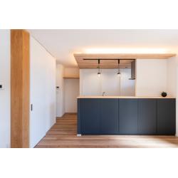 LDKと一体化したことで明るいキッチンへ。 生活感を極力出さないように食器や家電は背中の扉内にすべて収納できるように設計。 会話が弾むキッチン空間へ