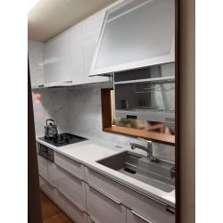 タカラスタンダード「レミュー」の白いキッチンに交換されました。天板がキラキラと光り、高級感溢れるキッチンに。