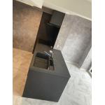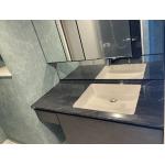 洗面所もブラックを基調とした洗面台にグレーの壁紙や大理石調の床でモノトーンでシックな洗面所が完成しました。