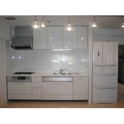 キッチン設備のリフォームです。キッチン設備・パネルは全て真っ白で統一し、床もかなり明るめのブラウンにしました。