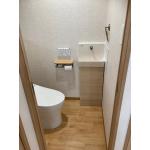 リフォーム後のトイレは、ナチュラルな木目調の床と明るい壁紙を組み合わせ、清潔感と温かみのある空間に生まれ変わりました。最新の節水型トイレを採用し、使い勝手はもちろん、日々の水道代の節約にもつながります。